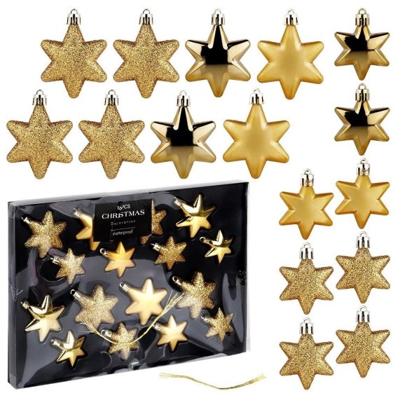 Zestaw 16 sztuk nietłukących bombek. W zestawie: 8x gwiazdki o średnicy 6 cm (2x matowe, 2x błyszczące, 2x brokatowe), 8x gwiazdki o średnicy 5 cm (2x matowe, 2x błyszczące, 2x brokatowe). Bombki prezentują się bardzo efektownie. Niezbędne do dekoracji choinek, kompozycji świątecznych i stroików. Będą stanowić wyjątkową ozdobę na choince. Z ich pomocą możemy w modnym stylu ubrać swoje drzewko świąteczne.