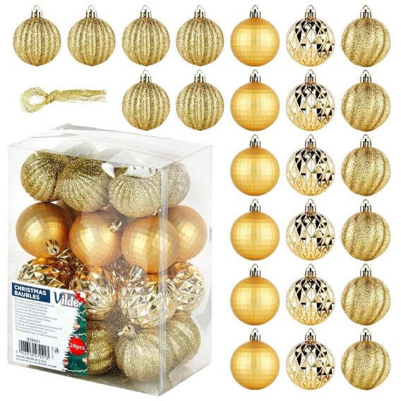 Zestaw 24 bombek w kolorze złotym, które dodadzą blasku każdej choince i stworzą magiczną atmosferę w domu. Każda bombka ma średnicę 5 cm. W zestawie występują bombki o różnych fakturach, takich jak błyszczące, brokatowe, wytłaczane czy matowe, co urozmaica dekoracje na choince. W zestawie sznureczki do zawieszenia.