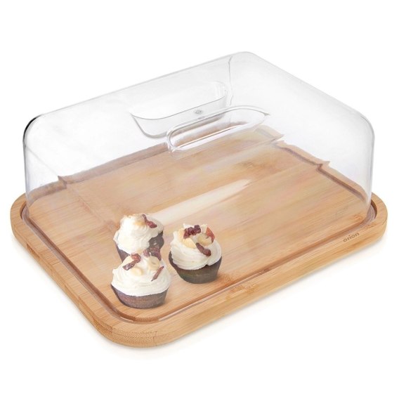 Prostokątna deska z przezroczystym kloszem. Deska ma wymiary z kloszem 28 x 22 x 11 cm. Idealne na przyjęcia, rodzinne spotkania i codzienne przechowywanie żywności.
