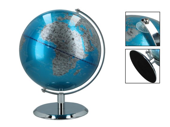 Utrzymany w kolorystyce niebiesko - srebrnej, bardzo elegancki globus będzie świetną dekoracją salonu. A może będzie netchnieniem do podróży? Nazwy geograficzne w języku angielskim i chińskim poszerzarzą horyzonty :