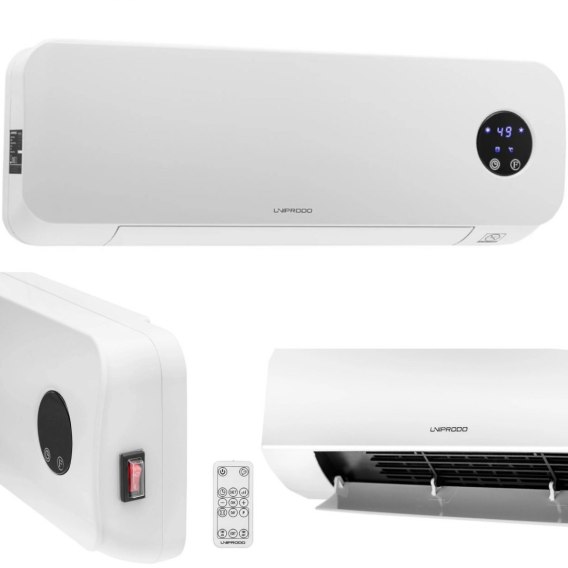 Grzejnik ceramiczny marki Uniprodo sprawdzi się do krótkotrwałego ogrzewania biura, domku letniskowego, łazienki czy warsztatu. Temperatura regulowana jest w zakresie 10-49C. Pilot umożliwia sterowanie sprzętem z odległości do 6 m. Wbudowany timer pozwala na włączenie lub wyłączenie automatyczne w określonym zakresie do 12 godzin. Wszystkie ustawione wartości widoczne są na wyraźnym wyświetlaczu LED. Funkcja wykrywania otwartego okna pozwala na wyłączenie automatyczne urządzenia z powodu różnicy temperatur. Bezpieczeństwo sprzętu zapewnia ochrona przed przegrzaniem. Dołączone akcesoria umożliwiają łatwy montaż na ścianie.