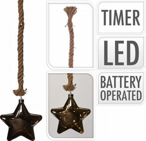 Ozdoba bożonarodzeniowa gwiazdka na sznurku 15 LED Ta dekoracja świąteczna będzie ozdobą każdego pomieszczenia. Pięknie prezentuje się zarówno w salonie, przedpokoju, pokoju dziecięcym jak i w sypialni. Można ją zawiesić w oknie, na ścianie, położyć na świątecznym stole czy stoliku nocnym. Dzięki niej stworzysz przytulną atmosferę. Gwiazdka posiada timer, który działa w trybie 6/18. Po sześciu godzinach lampka się wyłączy, by po 18 godzinach ponownie się włączyć. Specyfikacja średnica gwiazdki: 18 cm, długość liny jutowej 95 cm z 9 lampkami LED ilość lampek w szkle: 15 LED, przydymione szare szkło, zasilana 2 bateriami AA ( nie dołączone do zestawu).