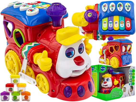 Na dachu lokomotywy umieszczone zostały kolorowe przyciski oraz pianinko. To seria przeróżnych dźwięków, melodii, odgłosów zwierząt oraz pociągów itp. Boki ciuchci tworzą sorter, dzięki czemu dziecko poprzez umieszczanie klocków w prawidłowych otworach ćwiczy zdolności manualne oraz poznaje kształty i kolory. Lokomotywa posiada również bagażnik, po otwarciu którego mamy dostęp do wrzuconych wcześniej klocków. Klocki z pewnością przykują uwagę każdego dziecka - każdy jest w innym kolorze, innym kształcie oraz z innym owocem zamkniętym wewnątrz. Dodatkowo na każdym klocku znajduje się inna literka: A, B, C lub cyferka: 1, 2 lub 3.