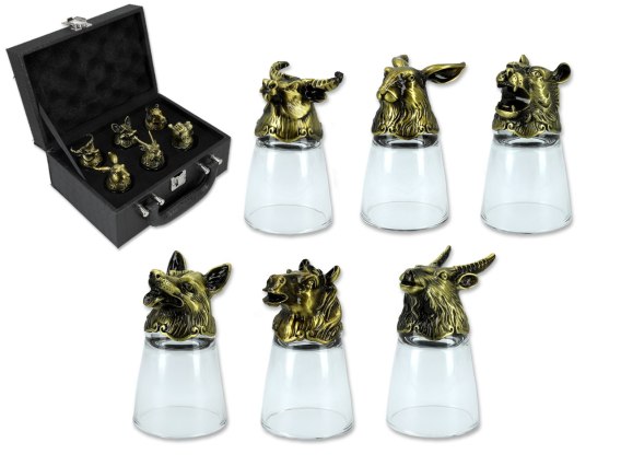 Męski, klasyczny komplet do alkoholu. Sześć szklanych kieliszków o prostej formie, zwieńczonych motywem głów zwierząt.