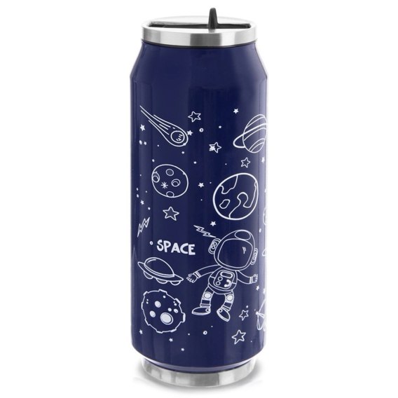 Wykonany ze stali nierdzewnej w granatowym kolorze z grafiką przedstawiającą kosmos. Ustnik w kolorze czarnym wykonany z tworzywa.