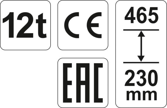 Udźwig podnośnika wynosi 12 ton, a zakres podnoszenia wynosi od 230 mm do 465 mm.
