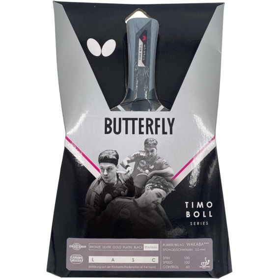 BUTTERFLY Timo Boll Titanium to rakietka przeznaczona dla graczy z doświadczeniem którzy chcą doskonalić swoje umiejętności. Zatwierdzona przez ITTF guma Wakaba z 2 mm gąbką oraz technologia Ergo Grip oraz Carbon Fleece.
