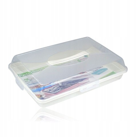 Posiada poręczny uchwyt przymocowany do pokrywki, dzięki czemu łatwo się go przenosi - nawet, gdy jest pełny. Nie musisz martwić się o zawartość pojemnika dzięki bezpiecznemu zamknięciu z 4 solidnymi klamrami. Przezroczysty wierzch umożliwia wgląd do wewnątrz. Wszystko to wpływa na fakt, że jest wygodny w użytkowaniu i bardzo praktyczny.