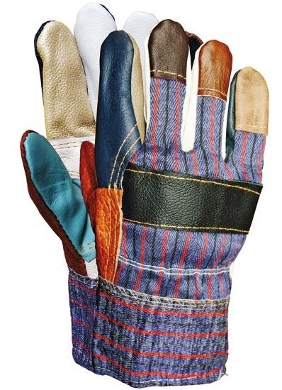 Rękawice ochronne ocieplane wzmacniane różnokolorową skórą bydlęcą.