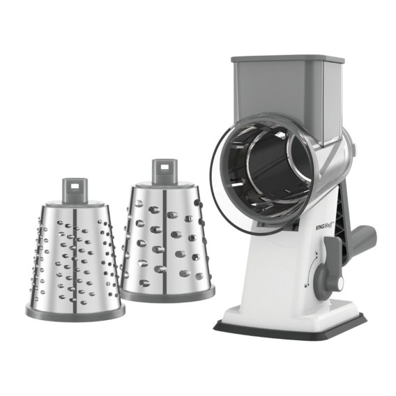 Wielofunkcyjna tarka bębnowa 3 w 1 KINGHoff w eleganckim szarym kolorze to niezastąpione narzędzie w każdej kuchni. Dzięki trzem wymiennym bębnom z wytrzymałej stali nierdzewnej 420 z łatwością zetrzesz, pokroisz lub poszatkujesz warzywa, owoce, sery, orzechy czy czekoladę. Doskonale sprawdzi się zarówno w domowej kuchni, jak i w restauracjach czy stołówkach.