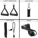 Zestaw zawiera:  4 gumy oporowe, 1 gumę elastyczną, 1 opaskę oporową, 2 piankowe uchwyty na ręce, 1 uchwyt na kostkę, 1 uchwyt pod drzwi oraz skakankę.