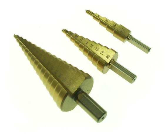 Komplet stopniowanych wierteł do metalu, wykonanych ze stali HSS, pokrytej tytanem.