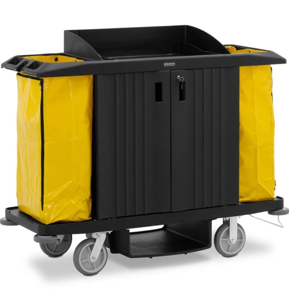 Wózek hotelowy marki Ulsonix to uniwersalne narzędzie do efektywnego sprzątania budynków. Sześć półek pozwala przechować środki czystości, narzędzia pracy i wszystko, co potrzebne. Sprawdzi się w hotelu, szpitalu czy kompleksie biurowym. Nośność wózka wynosi 250 kg. Jest on wyjątkowo zwrotny i wydajny podczas sprzątania. Najważniejsze narzędzia, takie jak szczotki, ściereczki czy worki na śmieci, można przechować na górnej półce i zawsze będą pod ręką. Podzielone obszary zapewniają porządek, a krawędź półki zapobiega staczaniu się przewożonych sprzętów. Górna półka wytrzymuje obciążenie do 50 kg. Szafka z dwoma przegródkami znajdująca się pod spodem oferuje dodatkową przestrzeń na środki czyszczące i inne przybory do sprzątania. Półka zniesie obciążenie do 25 kg, podczas gdy dolną sekcję można z łatwością obciążyć do 50 kg. Pod szafką znajduje się również otwarty schowek o nośności 25 kg. Drzwi wózka hotelowego zamkniesz na dwa klucze, dzięki czemu łatwo można zabezpieczyć żrące środki i narzędzia przed nieupoważnionym dostępem. Dwie torby o pojemności 91,6 l umieszczone zostały po bokach wózka do sprzątania. Wykonano je z mocnego materiału odpornego na rozdarcia. Z łatwością można go wyczyścić wodą z mydłem. Możesz bez problemu wyjąć zebrane pranie lub pełne worki na śmieci, otwierając zamki w nylonowych workach o wymiarach 44 x 26 x 80 cm. Każda z półek bocznych ma nośność 50 kg.