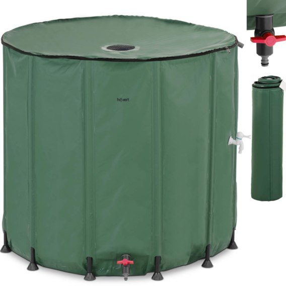 Zbiornik na deszczówkę marki Hillvert posiada dużą pojemność 1000 l. Sprawdzi się w gospodarstwie domowym, w terenie, na biwaku czy na działce. Pojemnik łatwo ustawić, pokrywa z odpornego na rozerwanie PVC naciągana jest za pomocą plastikowych prętów, które zapewniają stabilność. W pokrywie znajduje się otwór do odprowadzania wody deszczowej do wnętrza. Filtr siatkowy zapobiega dostawaniu się do środka zanieczyszczeń oraz liści. Dla optymalnego zarządzania wodą pojemnik posiada trzy odpływy z filtrami utrzymującymi czystość wody. Kran pozwala napełnić konewkę, kurek spustowy na dole ma przyłącze3/4", można je wykorzystać do węża ogrodowego. Kurek przelewowy chroni beczkę podczas ulewnego deszczu. Wykorzystane materiały są trwałe i przeznaczone do użytku na zewnątrz. PokrowiecPVC wykonano z tkaniny 500 D. Elastyczne materiały pozwalają złożyć zbiornik do transportu lub przechowywania.